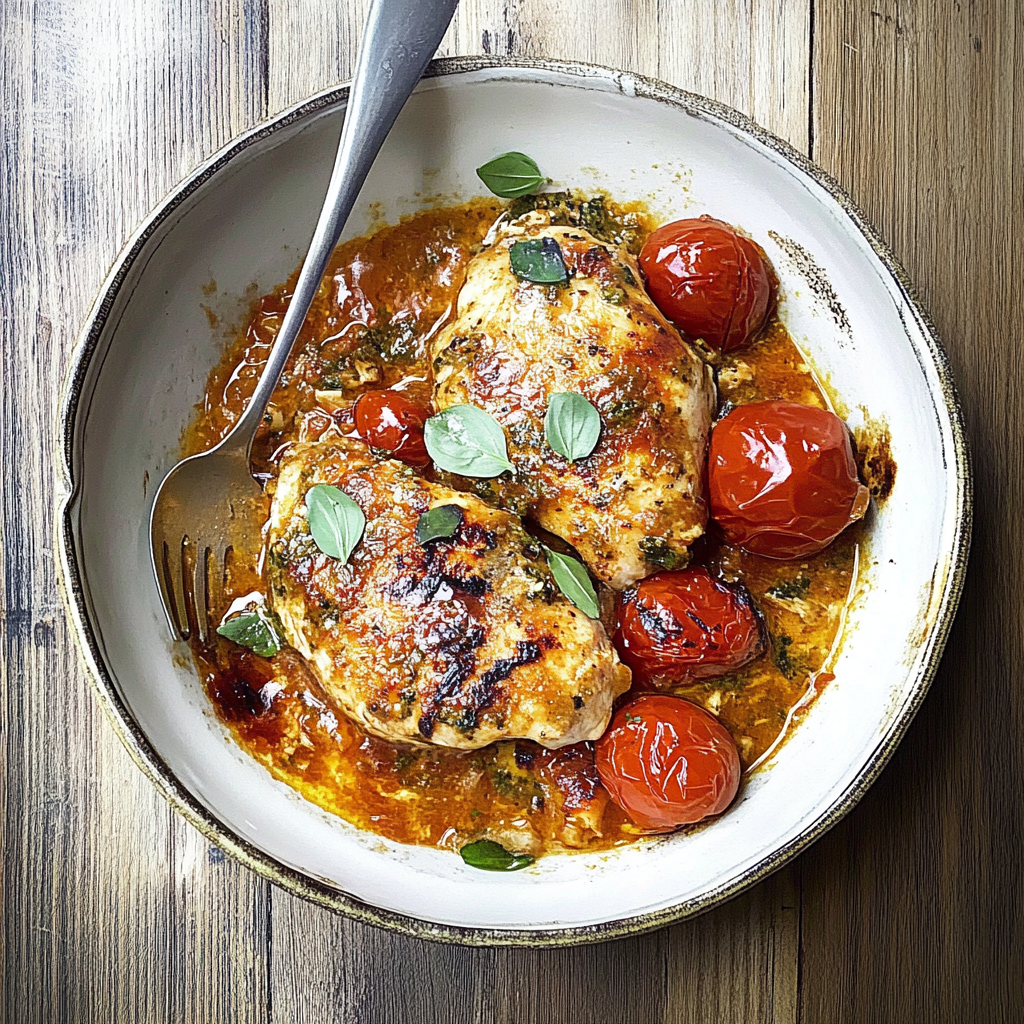Bake It All Together: Bake for approximately 20-25 minutes until chicken is cooked through (165°F internal temperature) and tomatoes are blistered and juicy.