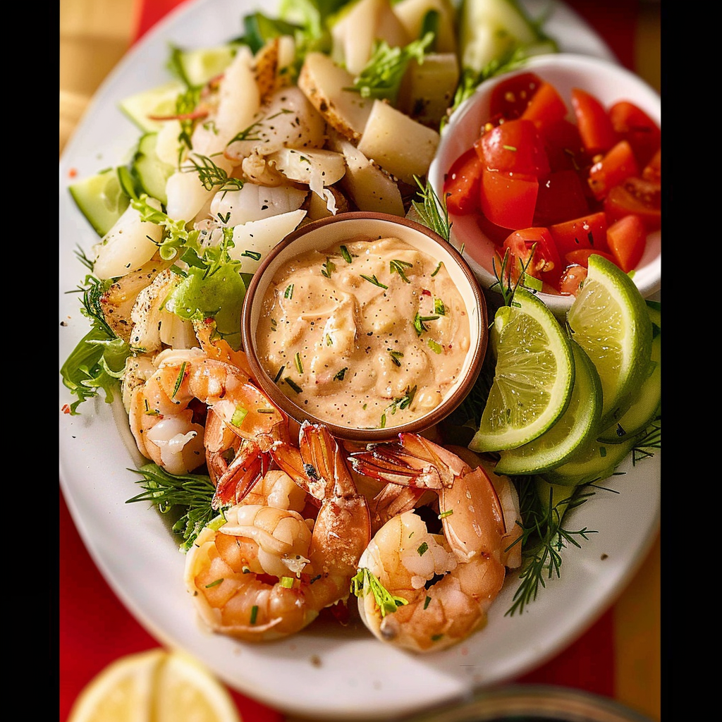- Garnish with lemon wedges and fresh herbs, then place the cocktail sauce in the center for dipping.