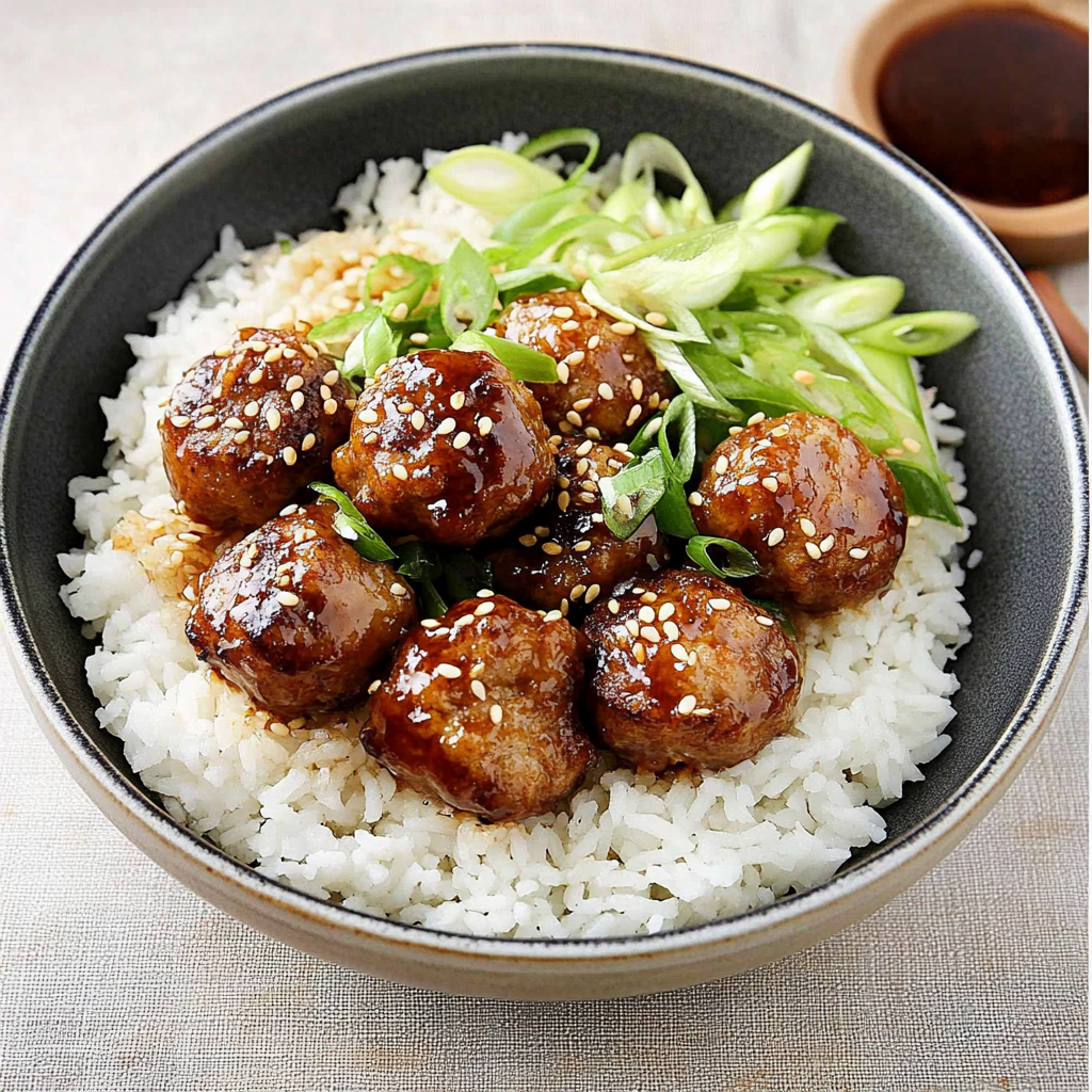- Serve meatballs over fluffy rice and garnish with green onions and sesame seeds.