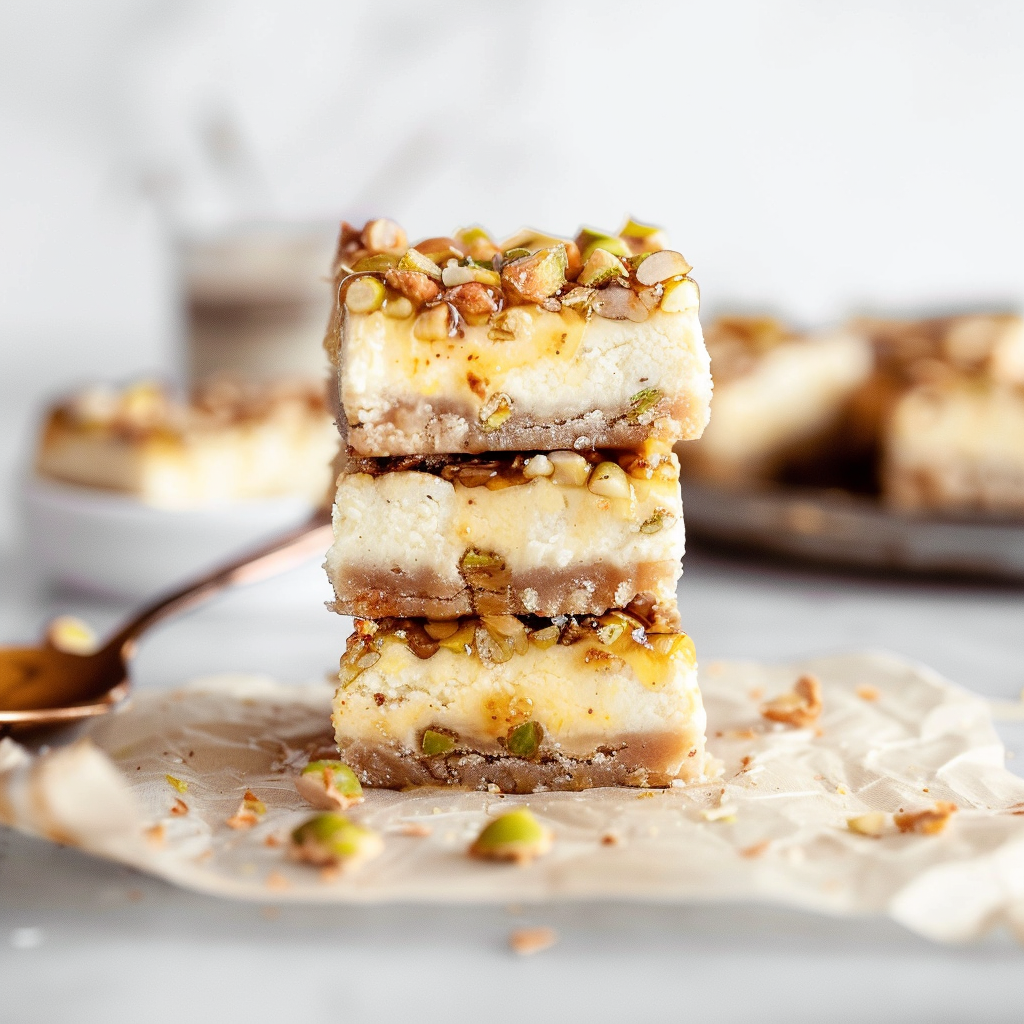 These bars blend rich cheesecake flavors with crispy baklava layers and a hint of tahini, creating a delightful fusion of textures and tastes that stand out from traditional desserts.